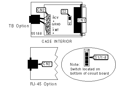 Note: Network interface (CN2) is available with several connector options. Device may feature a terminal block, RJ-11, RJ-45, or 25-pin (male or female) connector. | |||