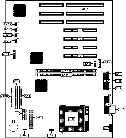 32-bit PCI slots (4), floppy drive interface, game/MIDI port, IDE interfaces (2), parallel port, PS/2 mouse port, serial ports (2), ATX power connector, line in, line out, microphone in, wavetable connector, audio in – CD-ROM